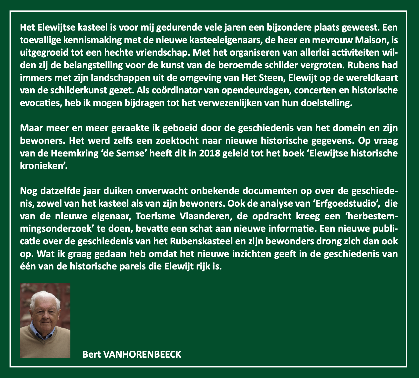 Nadat Toerisme Vlaanderen in de zomer van 2019 eigenaar werd van het kasteel, kreeg ‘Erfgoedstudio’ de opdracht om een ‘herbestemmingsonderzoek’ te doen. Het rapport van het onderzoeksteam bevat een schat aan nieuwe informatie. Ook recente ontdekkingen door Bert Watteeuw, dr. historicus en directeur van het Rubenshuis, over de aankoop van het kasteel door Rubens en zijn verblijf in Elewijt, leverden heel wat nieuw en interessant materiaal. Stof genoeg voor een nieuw boek!
